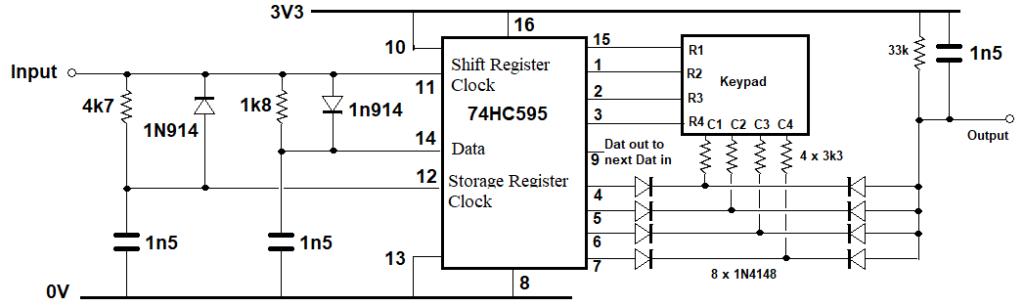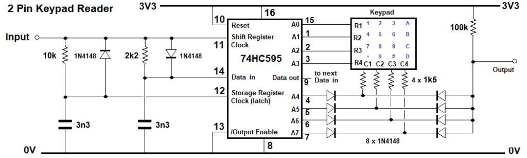 ' Keypad reader using a 74HC595 and 2 MCU I/O pins.