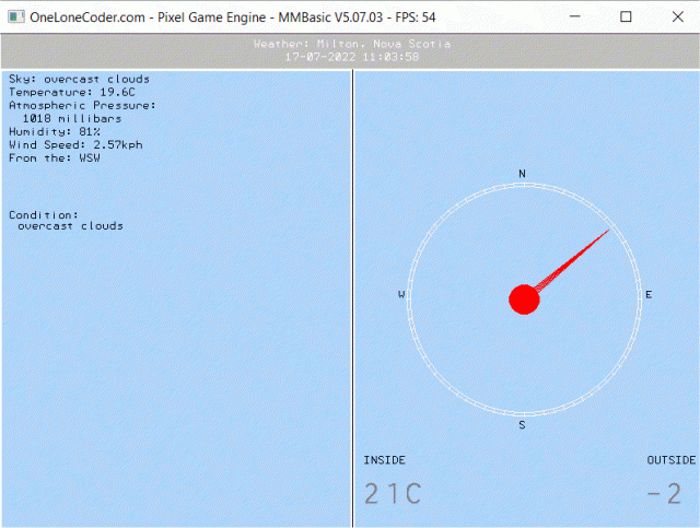In the lower right, outside and inside temperatures are hard coded, since no pins for connecting DS18B20s with MMBasic for Windows. At one time I had a web page set up on another device which had those readings, and another version of this program (F4, I think) got them--but I've lost track of that, so in this example they're unchanging awaiting revision (though I could just plug in the openweathermap.org temperature for "outside").