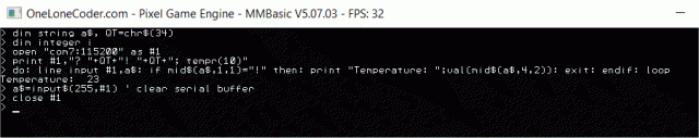 Congratulations. That's a good part of the battle. Here's how to read a DS18B20 temperature sensor attached to the PicoMite talking to MMBasic for Windows over serial. (Note--in order to get long lines to work, I set MODE 9 and FONT 1. Any error message changes the font, so if you are fiddling and get errors, you may need to repeatedly set FONT 1.) ![]() The code is: dim string a$,QT=34 ' scratch variable a$ and double-quote dim integer i open "com7:115200" as #1 ' change to suit your COM port print #1, "? "+QT+"! "+QT+"; tempr(10)" ' this says print "!" and temp from pin 10 do: line input #1,a$: if mid$(a$,1,1)="!" then: print "Temperature: ";val(mid$(a$,4,2)): exit: endif: loop a$=input$(255,#1) ' clear the serial buffer close #1 "Temperature: 23" gets printed. Note that I put the "DO" loop all on one line so that it could be typed at the ">" prompt. In a program, you would unroll the DO for legibility and so you could add comments. Reading a pin would be similar. After setting it up with SETPIN, you would do "print #1, "? "+QT+"! "+QT+"; pin(1)" (for instance). I put the PRINT "!" in to make it easier to pick out the line containing the returned temperature reading. I just noticed that you can use VAL(MID$(a$,2)) instead of VAL(MID$(a$,4,2)) and it will ignore leading spaces and give you any decimal places, e.g., 23.75. ~ Edited 2022-07-26 00:26 by lizby PicoMite, Armmite F4, SensorKits, MMBasic Hardware, Games, etc. on FOTS |