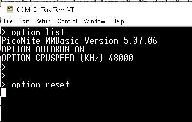 Nope, OPTION RESET crashes the PM in TT as well, so I am unable to reset to defaults. TT's menus etc still work, but you just can't do anything until you press reset on the PM module, at which point we're back to where we were before. I will try to manually reset the CPUSPEED back to 133MHz. ![]() If that does not work, I will reflash the firmware and try again, but WITHOUT setting the CPU speed down to 48MHz. I'll keep the thread updated. EDIT: Seems to be something to do with setting the CPUSPEED to 48MHz. Issued the command OPTION CPUSPEED 133000, PM then rebooted as expected. OPTION RESET then worked. NEW, then AUTOSAVE the code back to it again. OPTION AUTORUN ON, and eveything is working as expected. ![]() Not sure if this is a bug or I was just unlucky or something. Comments welcome. Edited 2023-03-05 12:09 by Grogster Smoke makes things work. When the smoke gets out, it stops! |