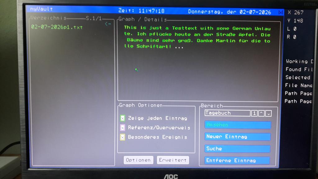 this is pretty impressive! Is there any chance that you come up with another font like the one you initially posted with german umlaute? I called it the "amiga" font, but I think it isn't what the file / font is named originaly, but there is the Amiga "A" in it   . I am using it for my Diary / Journaling program that I am currently working on. But it is "only" 8x8. Maybe there already is a little bigger font with the full set of chars? I don't know. Fact is: I am really thankful, that you came up with those "umlaut" font. I already created one myself about a year ago (or so), but it can't beat yours