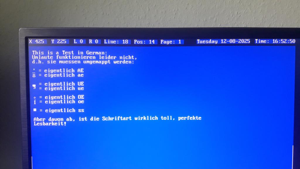 This was leading me to the false assumption the new DOS-font just has to be 224 and we are all good. For example the Unmlaut "ü" (kleines ü!) has the ASCII value of