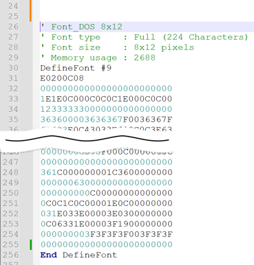 Ha! Now I understand   Yes, I will also try your suggestion with filling the lines with 0 until the space (32) begins. For now I am quite busy with my project. I am sure that your suggested solution will work. Then I will implement this great DOS-style font into my diary program with the built-in text-editor. This is a huge benefit, since it looks awesome and is good readable on HDMI screens.