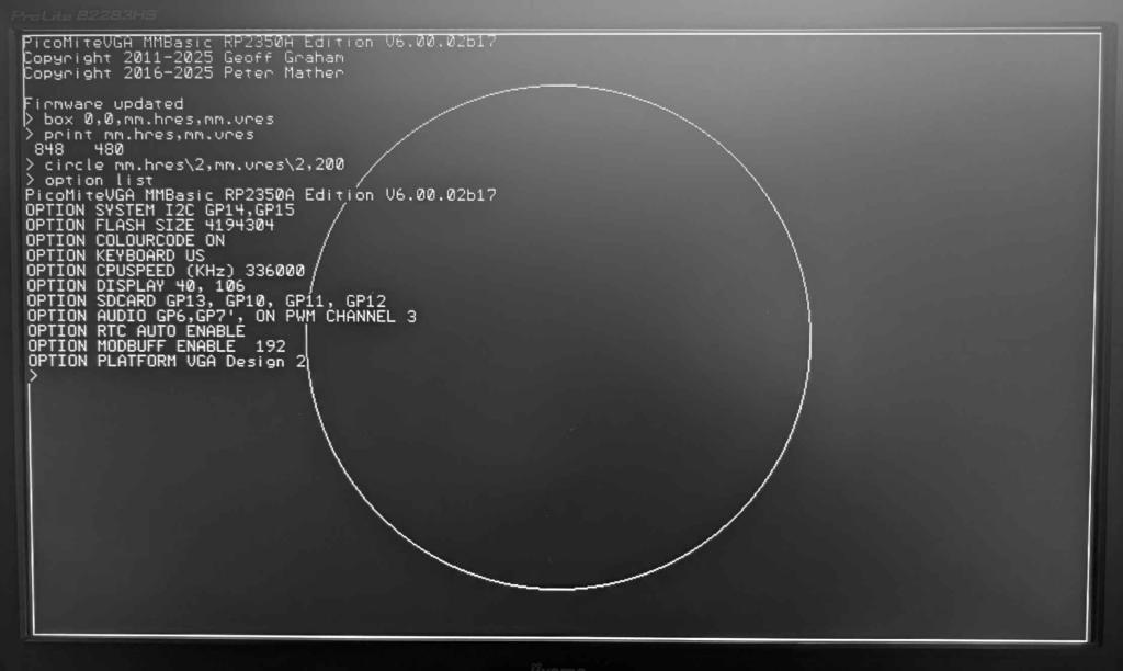 I've updated the betas for HDMI and RP2350 VGA to b18 These now all support 848x480 widescreen - same as mode 10 on the CMM2 To use the new resolution on HDMI use: OPTION RESOLUTION 848 Valid modes are: 1: 848 x 480 x 1bit with tiles 2: 424 x 240 x 4-bit with 1 layer buffer 3: 848 x 480 x 4-bit 5: 424 x 240 x 8-bit RGB332 On VGA use: OPTION WIDESCREEN ON/OFF Valid modes are: 1: 848 x 480 x 1bit with tiles 2: 424 x 240 x 4-bit with 1 layer buffer 3: 848 x 480 x 4-bit I assume only a proper widescreen monitor will show these correctly. CPU speed is 336MHz for both VGA and HDMI ![]() Edited 2025-03-11 05:25 by matherp |
