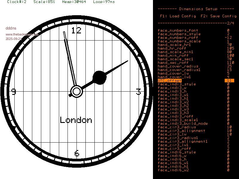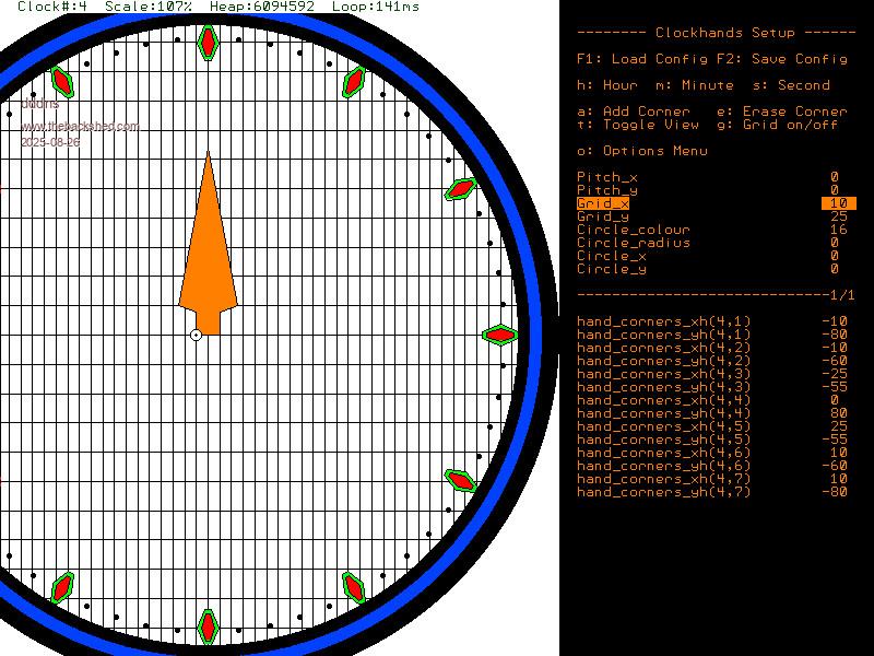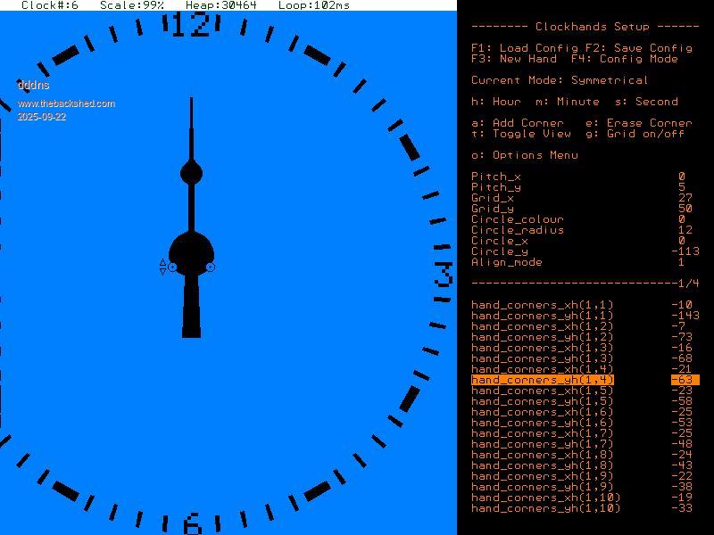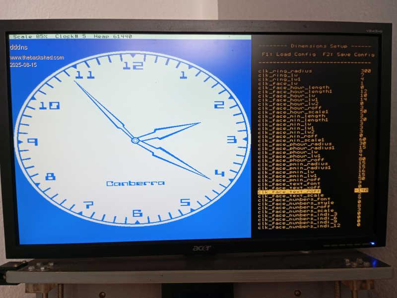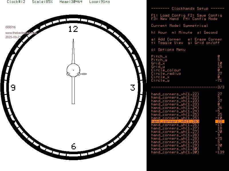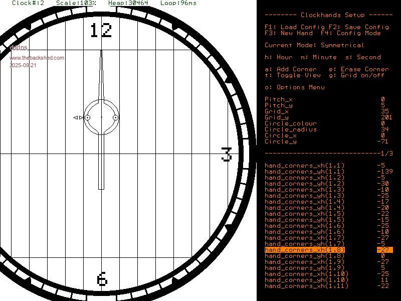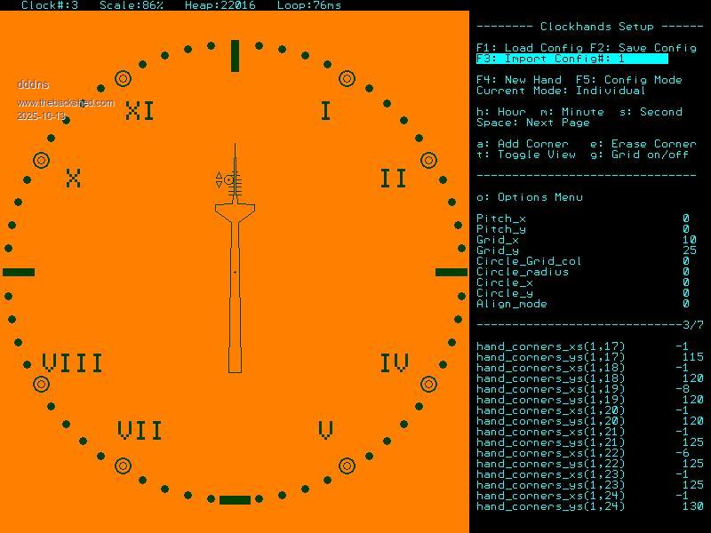 Hi dddns, Played with your V1 version a bit. Impressive how configurable this is. It could think this is a nice challenge for the forum "Who designs the nicest clock". I used your version on a 2350VGA platform with PSRAM. During my experiments I was able to surface a bug. See photo. Some of the hour markers are drawn into the menu, and are not erased anymore. Not even when you exit the menu. See the yellow circles in the menu. ![]() Thanks for this nice program. Volhout Edited 2025-09-24 16:59 by Volhout PicomiteVGA PETSCII ROBOTS |