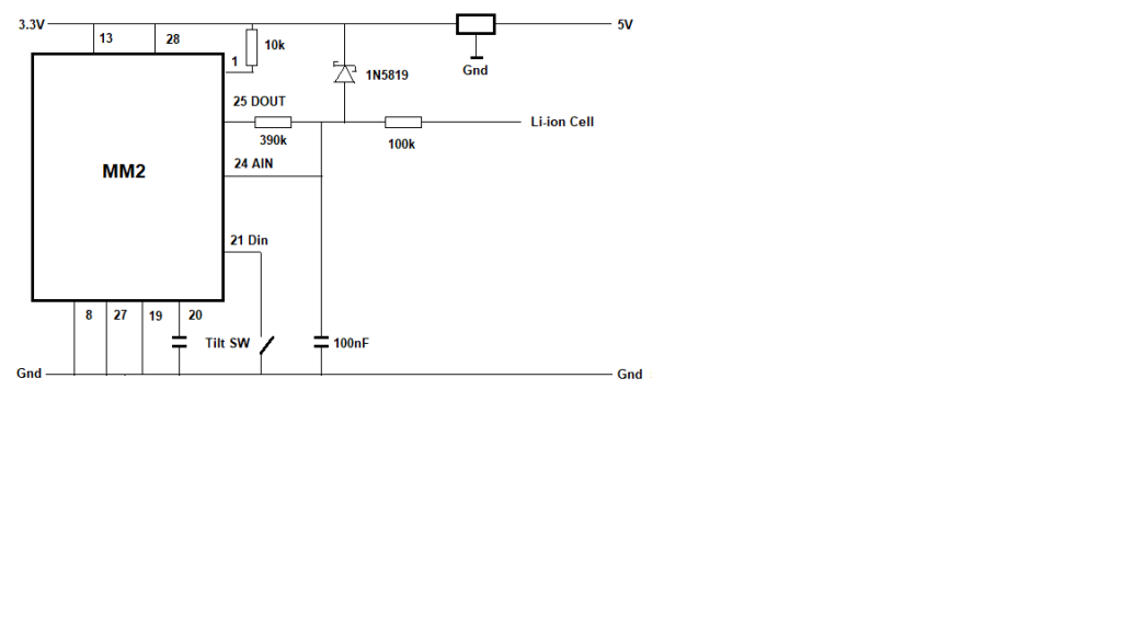 Here is a MM2 tested program for monitoring the tilt switch and Li-ion cell. It can read the cell volts up to 4.1V with the divider values shown in the diagram. If you only need up to 3.3V the lower leg can be removed. The current through the upper leg of the divider doesn't get wasted while the MM2 is sleeping. The lower leg of the divider gets switched off and the diode diverts the current to the 3.3V rail, helping power the MM2. When the cell volts are less than 3.4V no current will flow through it anyway. ' "Test cell V & tilt.bas" Print "Time",,"count","Cell V",,"Tilt" Do SetPin 25, DOUT, OC 'switch for voltage divider lower leg Pin(25) = 0 SetPin 24, AIN 'Cell Volts SetPin 21, DIN, Pullup 'Tilt switch input SetPin 22, DOUT, OC 'Tilt switch simulator, link to pin 21. Delete if real tilt sw. used Pin(22) = 1 If (n Mod 5)=4 Then Pin(22)=0 'activate simulated tilt switch ' Pause 10 'Allow time for capacitor on AIN to settle. If cap. isn't used remove this RTC gettime 'optional Print Time$, n, Pin(24)*(390+100)/390, Not Pin(21) 'insert your voltage divider values here SetPin 24, off SetPin 25, off SetPin 21, off SetPin 22, off n=n+1 'n = loop counter - optional If n > 19 Then End 'remove this for continuous running CPU sleep 5 Loop ![]() > RUN Time count Cell V Tilt 01:37:18 0 4.10765 0 01:37:23 1 4.12724 0 01:37:27 2 3.99417 0 01:37:32 3 3.96918 0 01:37:37 4 3.81719 1 01:37:42 5 3.74221 0 01:37:46 6 3.64764 0 01:37:51 7 3.44229 0 01:37:56 8 3.33219 0 01:38:01 9 3.25045 1 01:38:06 10 3.05997 0 01:38:10 11 2.85259 0 01:38:15 12 2.68441 0 01:38:20 13 2.16494 0 01:38:25 14 1.79613 1 01:38:30 15 1.41112 0 01:38:34 16 1.19629 0 01:38:39 17 0.880838 0 01:38:44 18 0.426234 0 01:38:49 19 0.263979 1 > Edited 2025-10-05 20:05 by phil99 Footnote added 2025-10-06 08:58 by phil99 In the circuit above the 5V to 3.3V regulator is a switch-mode type which is why I added the capacitor on the AIN pin (and Pause in the program). I assumed that noise would be an issue (similar to the cell-to-5V converter in Grogster's setup), however removing the capacitor and Pause make little difference. The noise is fairly low at about 20mV. |