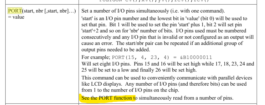 It's bad practice to use module pin numbers rather than GPxx numbers. The latter are used in the Datasheet documents for the chips and are also used by MMBasic. Module pin numbers are liable to change with every new module that's released, meaning that you get compatibility issues further down the line. e.g. module pin 1 of a Pico 2 is GP00 and is GND on a PGA2350. Mick Zilog Inside! nascom.info for Nascom & Gemini Preliminary MMBasic docs & my PCB designs |