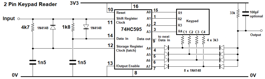 The fixed width font of a code box untangles the mess. That looks interesting so will have a go at reading it with MMBasic. It looks like you set the pin as an output to charge the capacitor then switch the pin to input and measure how long it takes to discharge. ┌────────────┐ The keypad that I tested with has an 8-pin header: │ 1 2 3 A │─┳──────┐ 1 - row 2 (4,5,6,B) │ │ 30K │ 2 - row 3 (7,8,9,C) │ 4 5 6 B │─┫ ⏚ 3 - column 1 (1,4,7,*) │ │ 30K 4 - row 4 (*,0,#,D) │ 7 8 9 C │─┫ 5 - column 2 (2,5,8,0) │ │ 30K 6 - column 3 (3,6,9,#) │ * 0 # D │─┫ 7 - column 4 (A,B,C,D) └────────────┘ 30K 8 - row 1 (1,2,3,A) │ ┣┻┻┻────┘ 7.5K ┣─────────────────── I/O pin 1000pF As I mentioned to Mick I have a heap of 74HC595s left over from a project years ago so they are effectively free. They must be good for something! :) Edited 2026-02-19 07:05 by phil99 |