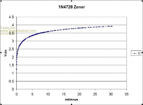 The 1N5819 looks to be doing its job beautifully.. The Zener slope is sort of what I saw .. I too bought 100 cheapo Chinese 3v3 Zeners and thought that was it but I then went about bought some 1N4729 3v6 Zeners from Jaycar and they reflected very similar voltages to the cheap Chinese units even though they were 0.3V higher..