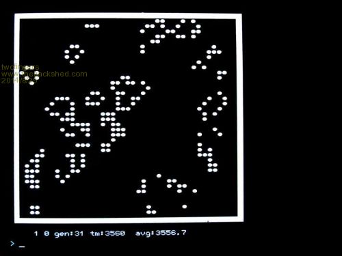 '*************************************** '* MMBasic 4.5 for Maximite/Duinomite '* twofingers at TBS 08-2014 '* No warranty, provided at your own risk. '* This code may be freely distributed without charge '* '* John Conway's '* "Game of Life" '* '* a code example/benchmark '*************************************** '*************************************** Cls '** plz edit field dimensions ** C_x =45 ' entire field width w. border C_y =40 ' entire field height w. border '******************************* C_x1=C_x -1 C_y1=C_y -1 L$=" ":X$="x" Option base 0 Dim w$(C_x,C_y,2) length 1 Dim a1(2),a2(2) t=0 clearworld '***** Plz select: Demo1 '***** or 'Demo2 gen=0:Timer=0:z=0 Line (1*6,1*8)-(C_x*6+6,C_y*8+12),1,BF a1(0)=2:a2(0)=C_x1 a1(1)=C_x1:a2(1)=2 Font #2,,1:fontbreite=12 titel$="The Game of LIFE" Print @((C_x*6/2)-(Len(titel$)/2*fontbreite),50) Titel$ Font #1 wait "Press any key!" '********** Mainloop *************** Do t1=Abs(t=0) println(5,C_y+3,Str$(t)+" "+Str$(t1)+" gen:"+Str$(gen)+" tm:"+Str$(Timer)) Timer=0 For x=a1(t) To a2(t) Step 1-t*2 Line (x*6,1*8+8)-(x*6+5,C_y*8+4),0,BF For y=2 To C_y1 c=n(x,y) a$=w$(x,y,t) If a$<>X$ Then If c=3 Then w$(x,y,t1)=X$ Else plotxy (x,y) If c=2 Or c=3 Then w$(x,y,t1)=X$ EndIf Next y Next x clearworld t=not t '0,1,0,1,0,... gen=gen+1 z=z+Timer println(25,C_y+3,"avg:"+Str$(Int(z*10/gen)/10)) Loop '********** END Mainloop ************* '* counting neighbors Function n (x,y) If w$(x-1,y,t)=X$ Then n=n+1 If w$(x+1,y,t)=X$ Then n=n+1 If w$(x-1,y-1,t)=X$ Then n=n+1 If w$(x,y-1,t)=X$ Then n=n+1 If w$(x+1,y-1,t)=X$ Then n=n+1 If w$(x-1,y+1,t)=X$ Then n=n+1 If w$(x,y+1,t)=X$ Then n=n+1 If w$(x+1,y+1,t)=X$ Then n=n+1 End Function Sub clearworld For x = 2 To C_x1 For y = 2 To C_y1 w$(x,y,t)=L$ Next Next End Sub Sub plotworld For x = 2 To C_x1 For y = 2 To C_y1 println (x,y,w$(x,y,t)) Next Next End Sub Sub println (x,y,s$) Print @(x*6,y*8) s$ End Sub Sub plotxy (x,y) Circle (x*6+3,y*8+4),2,F End Sub **** initial filling **** Sub Demo1 For x = 2 To C_x1 For y = 2 To C_y1 r=Rnd(randomize) If r<0.20 Then w$(x,y,t)=X$ EndIf Next Next End Sub Sub Demo2 ' Pentadecathlon, a period 15 oscillator ' (here you can create your own pattern) '1 2 3 4 5 6 7 8 9 10 11 Data "x","x","x","x","x","x","x","x" Data "x"," ","x","x","x","x"," ","x" Data "x","x","x","x","x","x","x","x" For y = 10 To 12 For x = 9 To 16 Read w$(x,y,t) Next Next End Sub Sub wait prompt$ If prompt$<>"" Then Print @((MM.HRes-Len(prompt$))/2,MM.VRes-12) prompt$ Do While Inkey$="":Loop If prompt$<>"" Then Print @((MM.HRes-Len(prompt$))/2,MM.VRes-12) String$(Len(prompt$)," ") End Sub Download: 2014-08-29_140916_TBS_LIFE.zip Always look on the bright side of life!