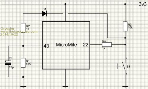 an alternative approach is to connect pin 43 to the junction between R2 and D1, and then replace D1 with a 0.1uF capacitor. this should generate a short negative-going pulse on the wakeup pin whenever the switch is closed. you may need to drop the value of R2 down to 100 ohms for this to work (or increase the time that the micromite is awake for).