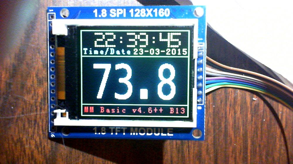 I penned up a simple time - temp program to test the newly supported unit... 2015-03-24_035743_1-8inch_LCD_B13_470.zip However, while playing with it, the firmware seems to have the DS18B20 bug where the displayed temp goes wonkey if the temp gets above 82 F... All in all, a good nights work... Yikes, past my bedtime... More later... |