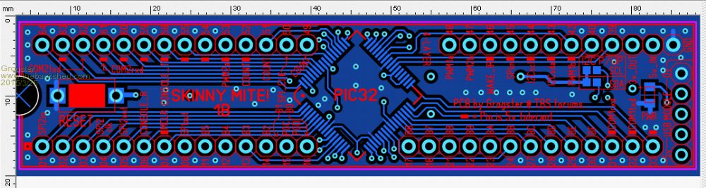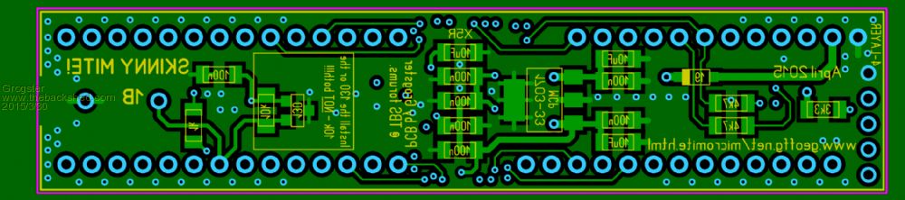 This is designed to directly accept one of WhiteWizzard's USB-serial modules, with the USB cable going away from the SkinnyMite off to the right. WW's USB module could either be plugged in if you used female header strip on the top of the SkinnyMite PCB, or you could permanently solder the WW USB board to the SkinnyMite for a permanent USB connection - albeit with a slightly odd-looking PCB shape if you did it like that permanently. The PCB takes the 5v USB feed from WW's module, but DOES NOT use the 3v3 from WW's USB module, as the SkinnyMite's on-board 3v3 regulator comes out to a pin you can plug into if you need 3v3, and the SkinnyMite regulator can handle more then the 50mA current limit of the WW board 3v3 output. Smoke makes things work. When the smoke gets out, it stops! |