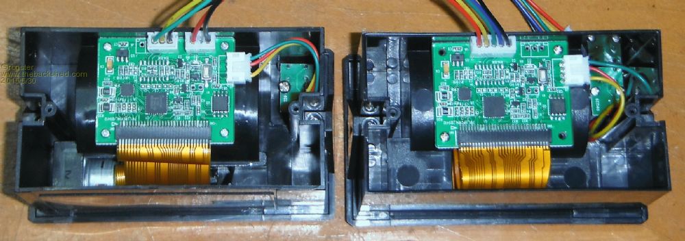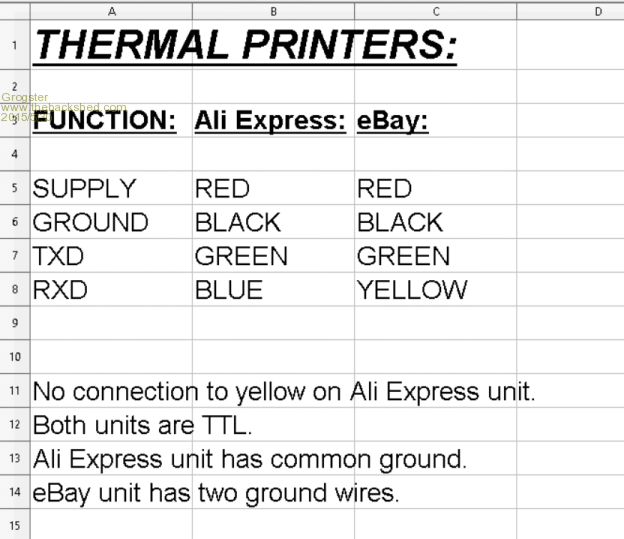 Changing the code page requires use of the software tool. By default, these printers come with the "Traditional Chinese" code page programmed into them, but once you have the tool, it is simple to select the code page you want to use. There is an Engrish document in the ZIP below showing how to do this, but you just run the exe programming tool, and follow your nose, really. Using this tool, you can also reset the serial baud-rate, but I left mine at 19k2 - seems to work well at that speed. Thermal Printer setup and documents ZIP file (9.7MB) EDIT: The printers from AliExpress do not print anywhere near as black as the eBay ones. Looking at the images of the printers with the backs off, you can see the circuit is exactly the same, but their are differences in the ribbon cable going off to the print head between the two. eBay unit is on left, AliExpress unit on right. My testing was with the same exact roll of paper, which was the good quality paper. BOTH the AliExpress printers have faint printout, although they work fine. This may be something that can be tweaked, as there are commands for setting the dot heating time, so extending this just a fraction may well then render the same results as the eBay units. I have two of each, and both eBay ones give great results, whereas both the AliExpress ones are faint in the printout. The AliExpress ones were much cheaper - about half the price of the eBay ones, so I suspect the AliExpress ones use a cheaper print head. I will have a play with adjusting the heat time on the AliExpress ones tomorrow to see if I can improve their printout. Smoke makes things work. When the smoke gets out, it stops! |