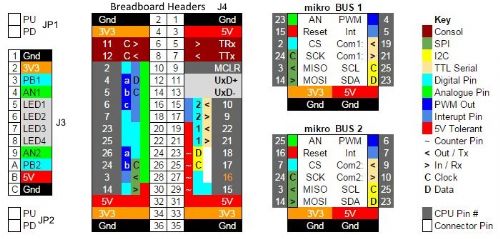 J3 provides the Minimum I/O accessory's needed in every project, two push buttons, two POT's and four LED's. JP1 and JP2 are used to set PB1 and PB2 as active Low or active high. J3 also routes Gnd, 3V3 and 5V power connections to the bottom of the breadboard to eliminate the need for long bridge links (as seen in the photo's) and facilitate split power buses.