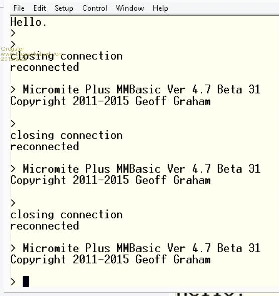 4) 'connected' comes up on screen, but MM+ has not run the code, it drops you to the command prompt.