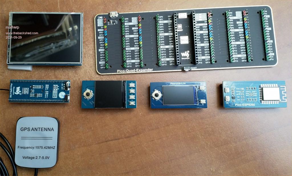 Also included are a Pico compatible mounted ESP8266, a Pico compatible mounted GPS, a 240x135 display with two buttons and a joystick, a 240x240 display with 4 buttons and a joystick and a 320x240 touch display with SDcard slot.