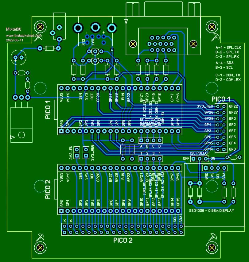 Twin PicoMites Another odd idea that came from some doodling.... PICO1 is a VGA device, with the usual display (simplified) and keyboard. I/O wired out. GP10-GP13 are wired to a 4-way female header, with pullups on GP10 and GP11. It gets it's supply from a linear regulator. PICO2 is a conventional PicoMite with an optional little SSD1306 display for debugging. All pins wired to a header except VBUS, VSYS. Pins GP18-GP21 are also wired to a female header. This device can be powered from the linear reg if required (Note - I forgot to run 5V to VSYS!). Links can be put between the two female headers to link the two PicoMites using I2C, COM port or SPI. So, you can use PICO2 as a master, with PICO1 as a slave display with keyboard or you can use PICO1 as a master with PICO2 as expanded I/O. I suppose you could do some sort of parallel processing. As there are 4 possible pins linking them you could use COM or I2C with interrupt lines in both directions or SPI with a single interrupt (CS isn't needed with a single slave). I'm not sure what I would use it for... :) Edited 2022-05-11 05:00 by Mixtel90 Mick Zilog Inside! nascom.info for Nascom & Gemini Preliminary MMBasic docs & my PCB designs |