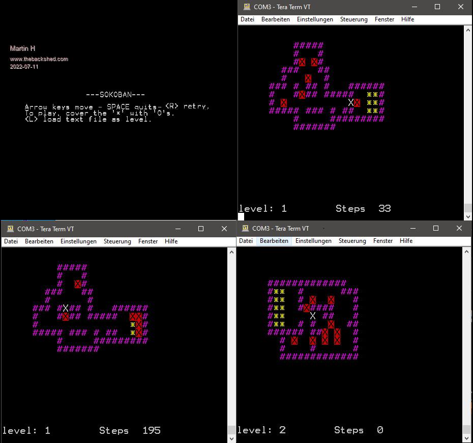 Just for entertainment .. I translated a QBasic Game into MM-Basic and made ir run in the terminal window. Have Fun ' Sokoban VT100 PicoMite ' from FreeBASIC QB mode/Qbasic/QB64 ' web: http://rudih.info ' converted to MMBasic (VT100) by Martin Herhaus VT100Ban.zip 'no comment |