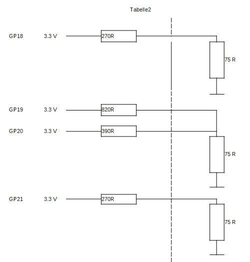 @Martin H. A trap when calculating Pico output currents or voltages is the Pin resistance (40 to 50 ohms) is in series. So the VGA resistors need to be lower than you expect. With LCD monitors (and most CRT's) a little overdrive does no harm and ensures a pure white when all 4 outputs are high, even if the resistor values aren't exactly right or perfectly matched. The clipping diodes aren't needed as the monitors A-D converters do the clipping for you. All monitors I have tested can tolerate an input of at least 1.5V without ill effect. @Lizby Your monitor blues appear to be a lack of blues! Does your monitor have a "Night Mode"? That would reduce the blue content. To see if the problem is at the Pico end measure the voltages on the VGA socket pins. With MODE 2 CLS RGB(WHITE) Using a multimeter I get 0.55V on red and blue and 0.57V on green. These are lower than you get on a CRO because of the blanking intervals. The important point is that red and blue should be the same. The resistors I am using are:- Red = 220R Green H = 330R Green L = 680R Blue = 220R 'Generate Colour bars. RGB(1,2,1) 4 bit Mode 2 Dim integer i, R=0, G=0, B=1 For i=1 To 301 Step 20 If i > 155 Then : R=255 : Else : R=0: EndIf B=(Not B)*255 Select Case (i Mod 160) Case 1 : G=0 Case 41 : G=64 Case 81 : G=128 Case 121 : G=255 End Select Box i,1,20,240,1,RGB(R,G,B),RGB(R,G,B) Next Or modifying the previous one to also get all 16 colours. mode 2 dim integer i,j,k,c,x,y=1 dim integer xx=mm.hres-1,yi=mm.vres/16 for i=0 to 1 for j=0 to 3 for k=0 to 1 c=rgb(i*255,j*64,k*255) box x,y,xx,yi,,c,c y=y+yi next k next j next i Edited 2022-08-25 18:32 by phil99 |