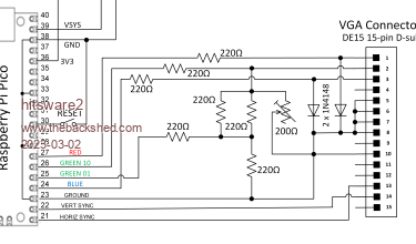 Almost, Pin 28 is a Ground pin. 220R should work but 270R puts a little less load on the Pico pin yet still gets close to 100% brightness. Although Pin 24 (GP18) is the Blue signal it has the lowest colour number so any number from 0 to 127 is Black and 128 to 255 is Green with the following connections. Green Only Pico pin VGA 24 GP18 blue x---------270--------x 2 green 23 Gnd x--------------------------x 5,6,7,8,10 Gnd 22 GP17 V Sync x------------------x 14 V Sync 21 GP16 H sync x------------------x 13 H sync |