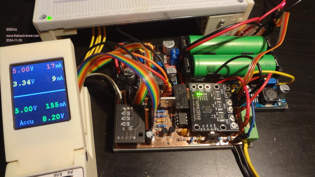 This delivers the power through a diode to the bms which charges till 8.4V at the batteries is reached. The power switch cuts both poles between bms and a 30W stepdown converter which generates 5V (below the red). From this It goes to another stepdown to the right which generates the 3.3V. All that power coming from the main switch goes through the INA3221 which measures total, 5V and 3.3V on its three channels. So if the main switch is off, the only power consumption comes from the bms which is 10µA.
