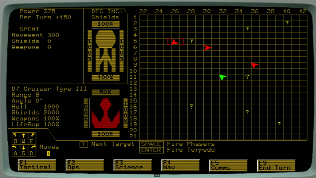In the original Star Trek game I thought the Klingons didn't present any challenge to the player, it was more about how you manage to move around fast enough to kill 36 enemy ships within the allotted time. The actual ships were easily dispatched with a single torpedo. In my game, I want it to feel like a naval battle, with two or more mighty warships slugging it out, with each battle being about maneuvering, tactics and licking your wounds in between fights. i.e. There should be real jeopardy that your ship will be destroyed.