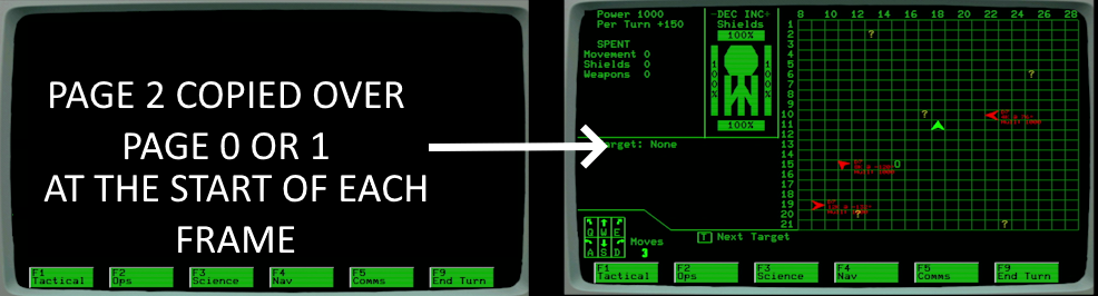 So I add some logic to draw the static background and save it to display page 2 (see image below). Now, whenever I need to clear page 0 or 1, I copy the background from page 2 - and just draw the foreground text and now the draw time is down to a respectable 45ms - or 22 frames per second. Which should be good enough for animations. The ship movement also feels far more responsive.