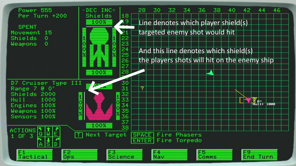I haven't tuned the power usage yet (in fact, despite what it says on the menu, firing phasers doesn't consume any energy currently), but it's starting to get that big naval ship vibe that I want. Each ship has 4 shields, and punching through the shields is essential to getting a kill, so I provide a white line marker on each ship's scan that shows where the other ships shots will hit (see image below). Infact in the video above, you can see that once I get through the port shield, the enemy turns so that I am facing their full strength front shields, forcing me knock those out as well.