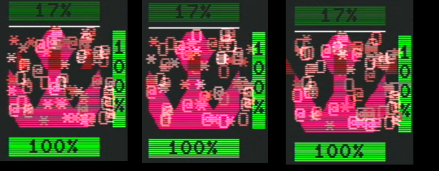 As I mentioned, we have three mode 1 graphics pages available on the Gen 1 CMM2. We are using pages 0 and 1 for the double buffering, which leaves us one more page to play with. Normally we would use this for storing sprites etc. which we would blit onto the main screen as needed.  But because we are remapping fonts and using text only, we don't really need this page just yet. So I use it to hold the bezel image, and when I want to clear page 0 or 1, I just copy the bezel from page 2 over the new screen that I'm about to write to. This clears off any old graphics, ready for a new frame (note the F-buttons are also part of the bezel - as they are the same for every screen in the game).