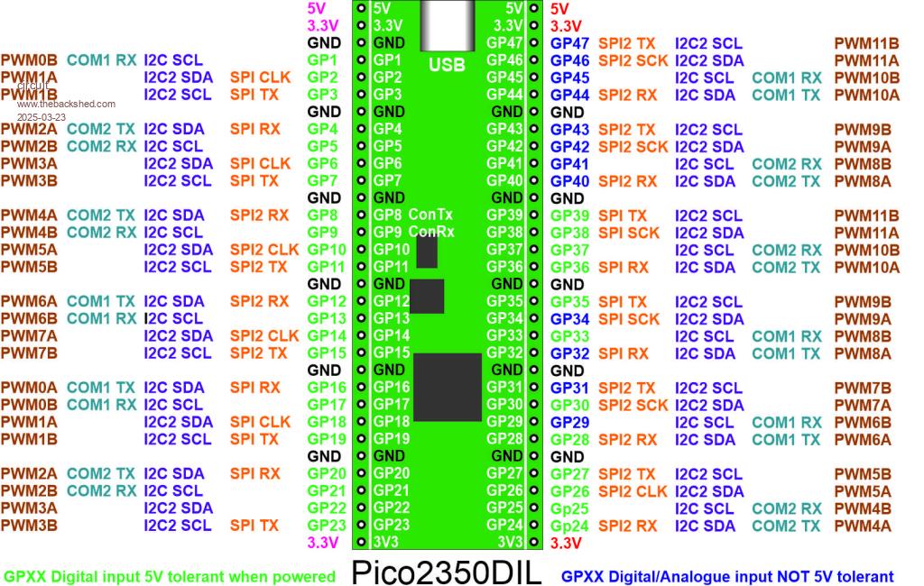 The board breaks out all 48 GPIO pins on the RP2350B except GP0 which is reserved for the PSRAM chip select. By default with the PicoMite firmware variants the heartbeat is not enabled for the RP2350B but you can use OPTION HEARTBEAT ON to enable it if required on GP25.