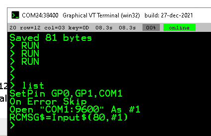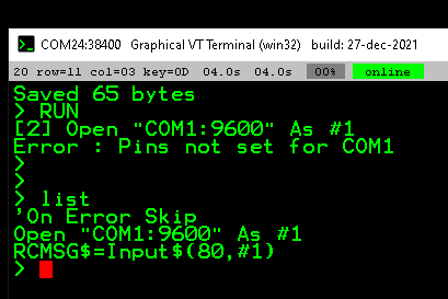 I understand your thought process. I have been porting over this code from an ARMITE F4 on which the code works but without the ON Error Skip and OPEN "COM1:9600" as #1. (As I open the port early in the program)
