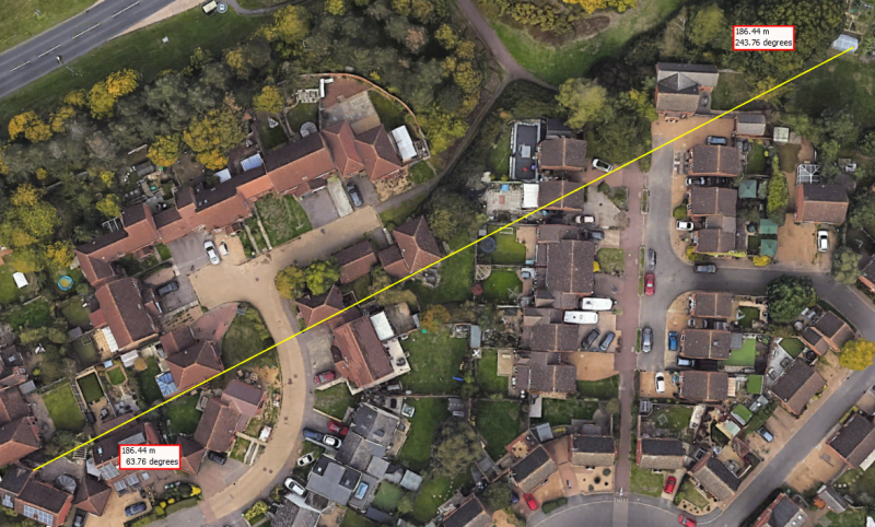 This is deinitely suburban. Residential to the south, warehousing/light industrial west, open countryside (for now) north and east with a highway in a cutting... so my plan is: 1. test with cheap crappy 433MHz modlues... don't judge, I have some on hand and with a full-wave whip might just be OK. The Tx are surprisingly good simple OOK devices - a bit messy but... it is usually the Rx that let's the side down. This is mainly me being cheeky and seeing if I can get it to work. Really tempted to skip this stage but it's an easy test and I'd like know if possible - I have read about people getting these to 300m LoS with a balanced dipole both ends, so who knows, sub 200m, almost LoS... if you squint at it and accept lofts are mainly empty space with some wooden bits... I actually think the line-up on the signal path is remarkable apart from that first building. 2. same test but with HC-12s... my first "serious" attempt to do it without LoRa. Again I have HC-12s on hand and I think the chips involved will make the absolute best of what can be had (from experience). If the Lora thing wasn't available I would focus on the antenna here but I think that has probably become un-necessary (saving me 60 quid) 3. I have a couple of HC-15 LoRa modules coming. If they do what they say, I think they will be the end of my tests if 2 fails. Actually, if they arrive before I am ready to do the tests, I will probably skip 1 & 2. I expect good things but I am worried about the lack of chat out there about these HC-15s specifically and the prospect of picking up a couple of duds. 4... 5... will very much depend on the outcomes of 1-3 but I think it will go down the LoRa route regardless. I will have to see. If I get to this stage and it still isn't working, I have plenty of info to proceed with. @Volhout cheers for that link harm. the Tx antenna will be on a small mast but I am by-lawed to about 2.4m. Rx antenna will be at eaves level on a normal two-story building (about 3m+) see? I told you I knew nothing about antenna design/capability... just that these little pigtail things are ok for short distances. TBH, I am not expecting to go down the yagi route now... if the LoRa modules check-out that is going to be it. Only if they turn out fakes will I start to consider HC-12s on a directional antenna - I also have aesthetics to consider cheers all h Edited 2025-04-16 01:17 by CaptainBoing |