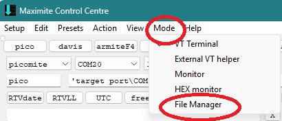 On the top line of MMCC you should see:- Setup Edit Presets Action View Mode Help At the bottom of the Mode menu is File Manager. Click it and the MaxiMite File Commander will appear. That is similar to the old Norton Commander. |
