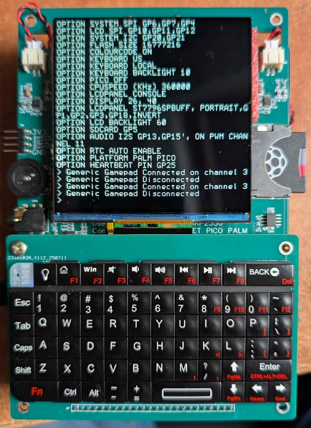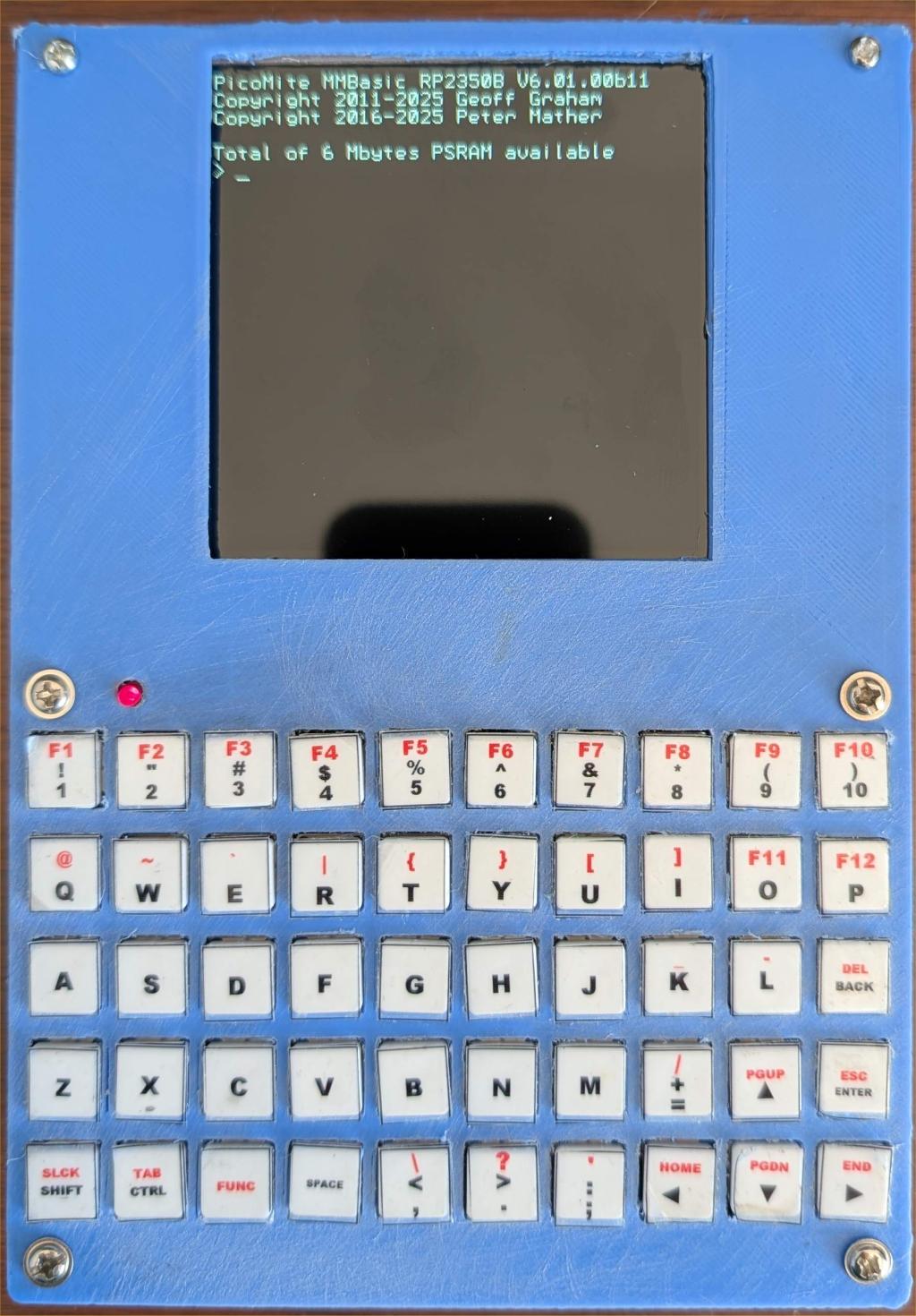 I've designed and draft printed a box - needs edges rounding etc. and I forgot to include a grill for the stereo speakers but I'm thinking about a major redesign. I'm really pleased with the keyboard and holding the box in the hands the "two thumb" approach to typing works well. The keys are nicely separated and have a good feel so that will stay. The display measures 73mm in width. It is IPS, very bright and clear and access to the display is lightening fast using the buffered ST7796S driver. See this demo However, the 320x320 4" diagonal display is somewhat dwarfed by the keyboard which is 124mm wide. My thoughts are to swap the display with a 5" IPS SSD1963 800x480 display - this one This has a width of 110mm so will match the keyboard much better. I would intend to run it by default in 400x240 pixel doubled mode so that it is S/W compatible with the Game*Mite again using a RGB332 buffered driver. This will give 50x24 characters using a 8x10 font as the default. Of course 800x480 would be available to the user by changing the display driver using standard options. Although the display is USD15 more expensive than the original it will reduce the cost of the motherboard as it includes the boost circuitry for the backlight. It will also let me reduce the space between the screen and the keyboard. The second big change is to use the Pimoroni PGA2350 rather than my DIL board. This will also reduce the cost and the PGA2350 is now stable at 360MHz which is my target frequency for the Palm Pico. Thoughts? ![]() Edited 2025-09-03 21:53 by matherp |