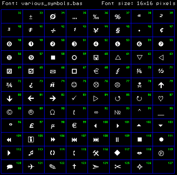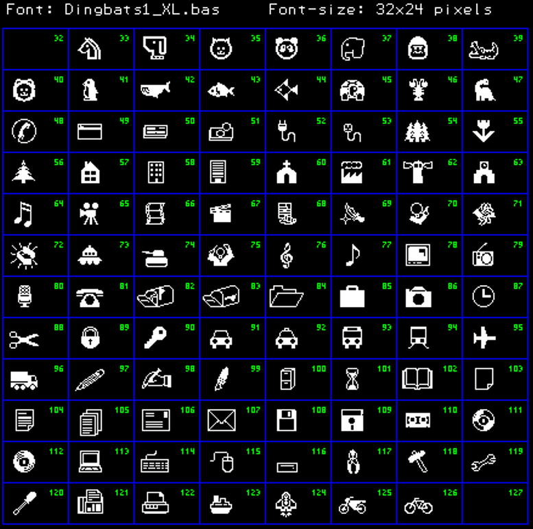 Hello I've looked a bit at the fonts that come with the firmware download. I thought the font "Dingbats1_XL" seemed interesting, I made a program that printed the font on the screen (see below). PicoMite firmware V6.00.03 ![]() Here is the program that prints the font on the screen. Dingbats1_XL.zip /Peter63 Edited 2025-07-30 15:23 by Peter63 |
