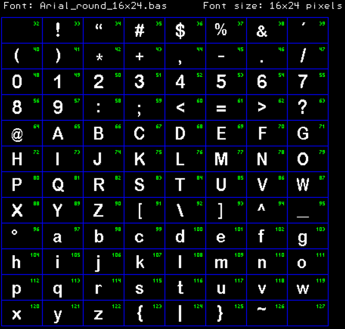 matherp Here comes the font. The program for printing is at the beginning. Arial_round_16x24.zip /Peter63 |