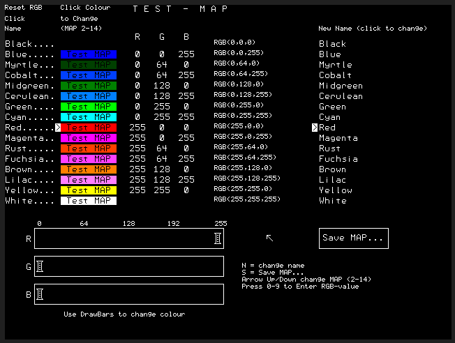 Hello RGB colors are quite interesting when you look at them more closely. I have made a program that makes it a little easier to make your own "MAP" files. The program is useful as it is today, but there are probably things that could be done differently. I'll leave it as it is today to see what kind of comments there will be. The program is written for PicoMiteHDMI MMBasic USB RP2350A Edition V6.00.03 and uses mouse and keyboard. ![]() CTRL+C to exit the program test-map.zip /Peter63 |