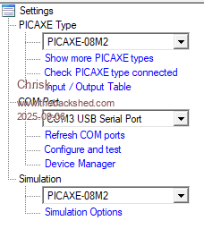 I tried all the suggestions except using the 20X2 chip. Grogster, how do I "Check PICAXE type connected" The only thing I haven't been able to eliminate is the cable itself. It is a Chinese copy of the AXE027 and I have tried both drivers, the one recommended by the seller and the one recommended for the genuine article. At one stage Mozzie(Lyle) said he was some 35km north of Melbourne. If Mozzie, you are prepared to test this cable for me on your gear I would be happy to travel. I would get in touch with you but I have no idea how to use PM. Regards Chris K |