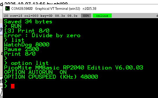 Hi Grogster, I think you are looking for a GWBASIC feature that is missing in MMBasic: ON ERROR GOTO reboot 'your code reboot: CPU RESTART 'option for a coldboot RUN 'option for a warmboot But we do not have ON ERROR GOTO Volhout Edited 2025-10-07 17:00 by Volhout PicomiteVGA PETSCII ROBOTS |
