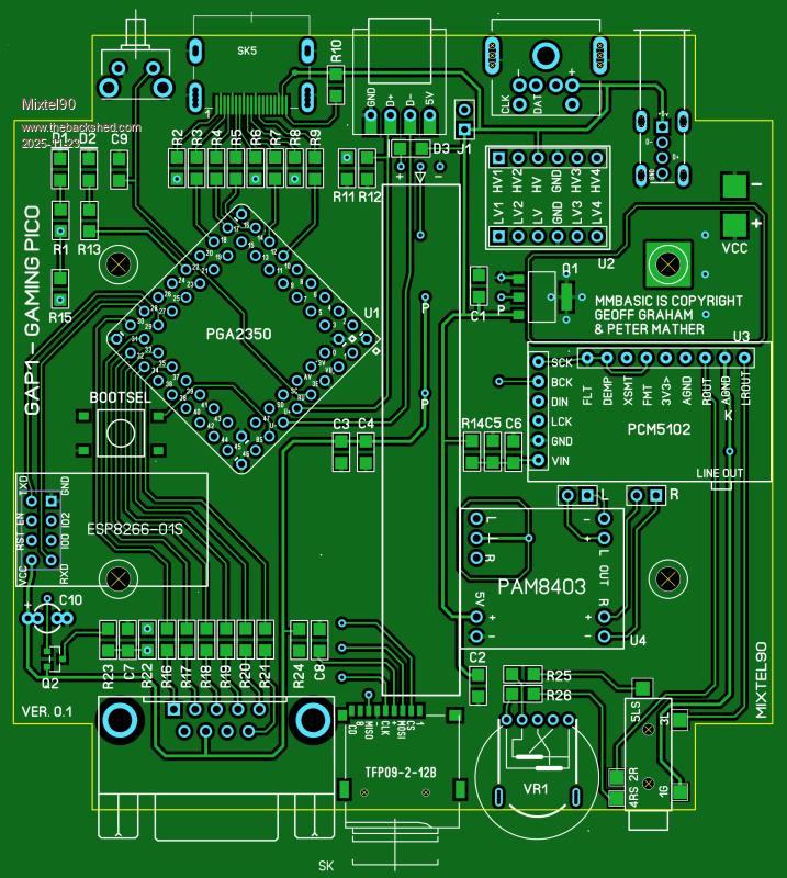 Sometimes I design something just for the pure joy of it. This is one of those. It's unashamedly a gaming machine - probably as close to the CMM2 as I can get using the Pico too. It is intended to be fitted into the Hammond square, translucent blue case so it even has flashy lights to play with. :) It's pushed along by the PGA2350 module, so you have PSRAM available. Neither GP0 nor GP47 are used so if you have a module that's been modified for GP0 it can still be used. I decided to forget USB, to remove a processing layer, and use a PS2 keyboard and mouse. It also saves a chunk of PCB area. The downside is that you can't use USB controllers. I also sacrificed the RTC as it needs an I2C port that I can't spare. However, there is space for a ESP8266-01S so you could set the time from a time server. The game port is very flexible though. This has every data pin reconfigurable in software. My idea is that at boot you can choose which controller you want to use by default and a library routine will set it up for you (it can also be reconfigured by your program). The port can also be used as 7 GPIO pins, GP46 has 100nF to GND though. You can choose: Atari joystick on GP40,41,42,43 and fire on GP46 NES/SNES on GP41,42,43 As all inputs can be ADC you could use an X-Y analogue stick with several buttons Both I2C ports on GP42,43 (I2C2) and GP44,45 (I2C) - both 3V3 I'm still undecided about audio. At the moment I envisage stereo down-firing speakers or fixed level line output via the jack socket. However I prefer headphones personally and I'm considering scrapping the line output and using speakers or headphones (via a better quality headphone amp). It's I2S anyway. A strip of four programmable LEDs is there just for the hell of it and to light the box up. :) I decided that I was going to use surface mount components where reasonably possible. That's so I can try building it on a hotplate! However, it's all 1206 (apart from a mosfet and the regulator) so quite easily hand solderable. I think it's one of my better-looking designs so far. :) Mick Zilog Inside! nascom.info for Nascom & Gemini Preliminary MMBasic docs & my PCB designs |