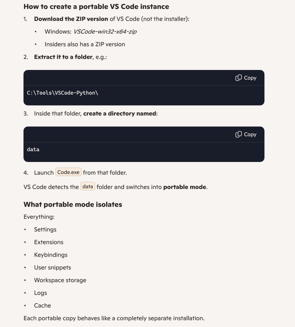 Note that using VSCode can get in a mess if you try and use a single installed version for multiple environments but you can create multiple separate VSCode environments and dedicate each one to a different use. Each of these will have full access to the AI once you load the extension in each case.
