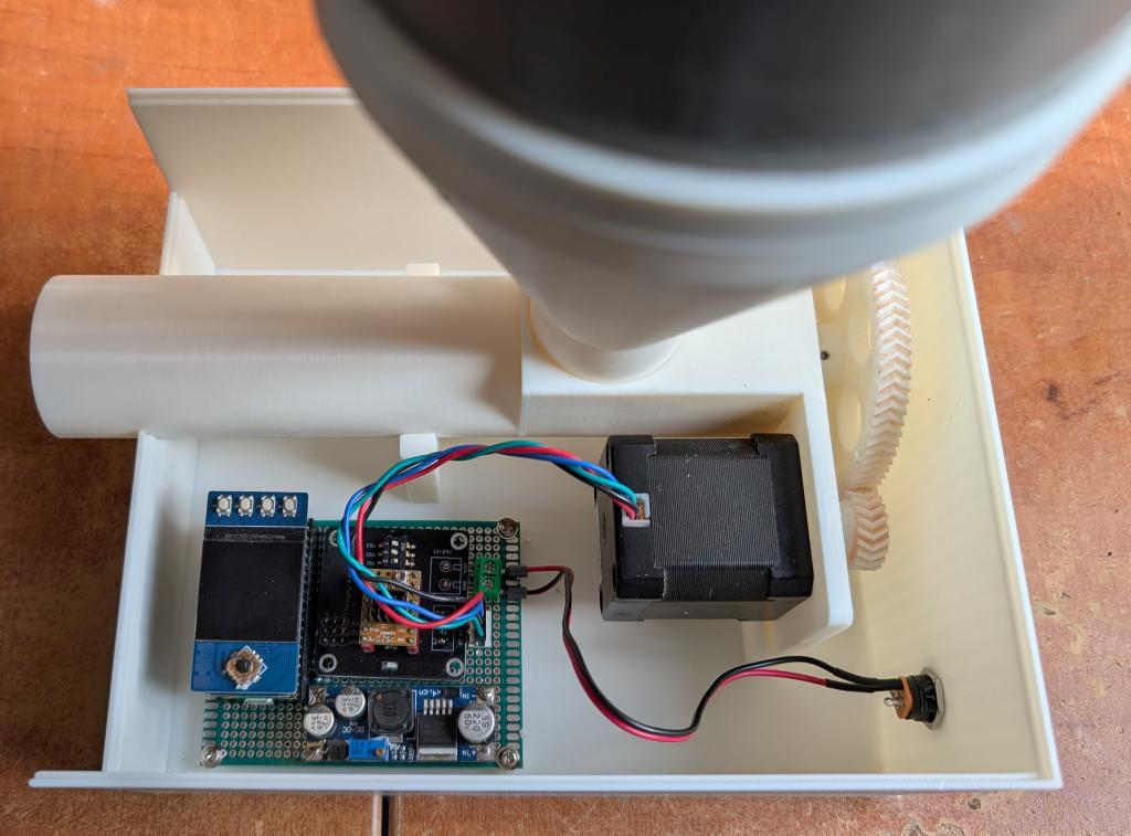 Everything 3D printed. STLs available if anyone wants them. Uses archimedian screw to deliver the food.