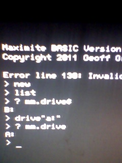 i have read that hyper terminal wont send files to "DRIVE A" IT CAN BE DONE BUT ITS A LITTLE TRICKY read this whole article before going ahead....important.... ok open up a hytrm at 9600 using what ever com port you have allocated to the silicon chip com port call it maxi and select a picture ... open it ... hit the space bar you should be logged onto the maximite now check to see which drive you are logged onto ...log onto DRIVE A ... type " XMODEM RECIVE "set.bas" example name given here.... enter these following steps must be done before the connection times out you will be seeing dollar sign`s going accross the screen....this is the counter ... make shure you know where exactly your file is on your pc-hdd ... in the hy-term select transfer select send file when the browse screen appears select your file to be transfered select :protocal::"xmodem" select your file ..click send ... all these steps must be done before the dollarsigns stop counting if you have done this correctly your file will start to transfer to DRIVE A ..... ..regards sparkey....///...// technicians do it with least resistance |