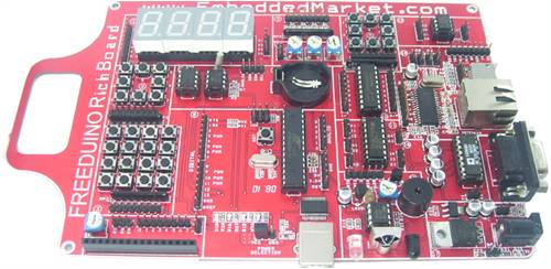 Thanks to Florin which sent me a link, I found this "Arduino" board with a lot of peripherals. I like the idea and presentation and in my opinion it have a great educational value. The connections between microcontroller pins and the peripherals on board are made with DuPont wires. Freeduino board. Though, a little bit expensive, but the idea is great (it can be made at home).