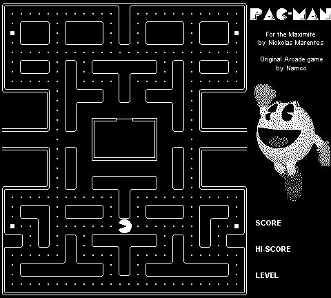 In another subject thread, I asked about whether there was a standard for joystick control on the Maximite. The reason for this was regarding the problems with keyboard control when using INKEY$ in a real-time arcade game application. The problem arises due to the Maximite's use of a keyboard repeat delay and repeat rate. This gives an inconsistent reading if the game requires movement control as a key is being pressed. The key doesn't always deliver the key value, reseting to zero as it pulses to the repeat rate. I have begun writing a version of arcade PACMAN for the Maximite and this was a problem due to the nature of the 4-way keyboard controls in PACMAN. I therefore considered writing it for joystick but I knew it would alienate many users from being able to play the game. I gave it some more thought and have adapted the keyboard logic to compensate for this and succeeded. Below is an image of what I have done so far. The PACMAN character can navigate all around the maze and eat all the dots. The speed and animation (mouth chomping) is just like the original arcade game and the use of an interrupt holds the game at a consistent speed. The game is fast enough so that if I turn off the speed control, the PACMAN moves around the maze as a blur, indicating there is plenty of time left to add the 4 ghosts on the screen and keep a speed that is very close to the original and operating just as smoothly. This is a work-in-progress and I will keep this subject thread up-to-date with my progress.