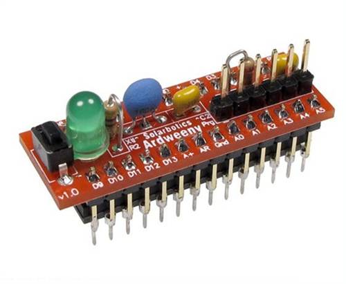 Ardweeny at Maker Shed It requires either an external USB-to-TTL FTDI-type cable or adapter, or else you just program the chip in an Arduino Uno (selecting the Duemilanove w/328 option in the IDE, since the Ardweeny 328's Duemilanove bootloader isn't compatible with the Uno or Uno R3 bootloader). |