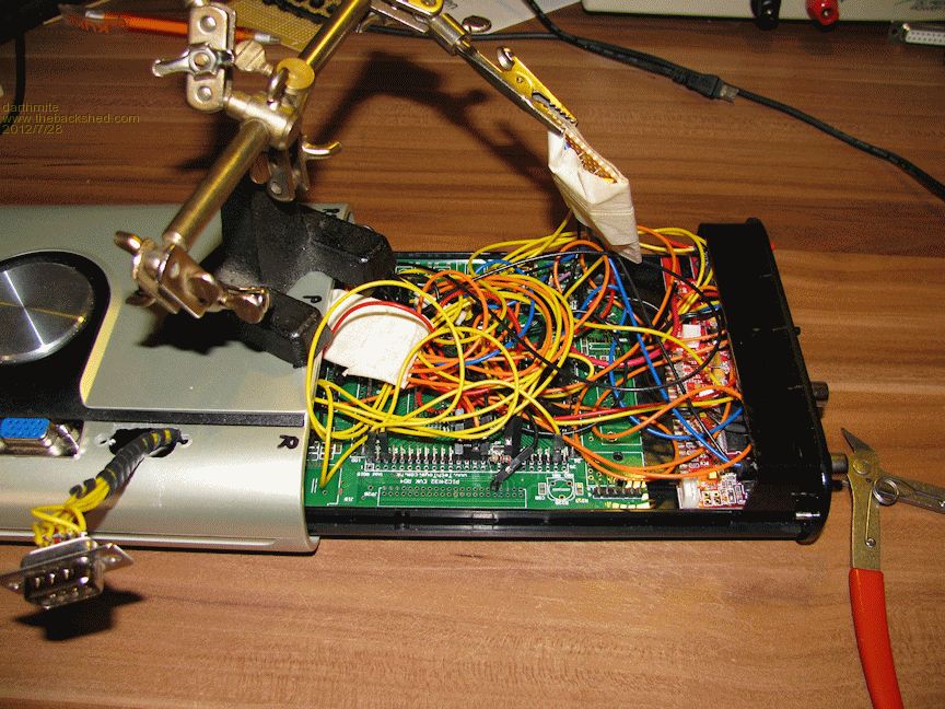 After made all holes and fixation , i finally put the whole thing in this box who was exactly the size i wanted. Then i started to connect all cables (they are allot !) and for get the power i just use the 5v output from the Hard Drive box ... he he he ... The 3.3v is made from the dev board then all was ok. And then ... Geoff <-- yea the 'Guru' ... is coming with a new maximite with colours , stereo audio etc !!! I was falling from my chair just to think about open the 'box' and change the connections , made a low pass filter for audio and add components to be able to have color graphics