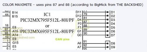 Lopezjim, Both systems use different chips! The colour maximite is build with a 512L (notice the L on the end of the partnumber) the 100 pin version. For can bus these pins canbe used: C1RX 87 bus receive pin C1TX 88 bus transmit pin C2RX 90 bus receive pin C2TX 89 bus transmit pin AC2RX 8 Alternate bus receive pin AC2TX 7 Alternate bus transmit pin The alternate for C1 (CAN1) has a pin that is already used for the sd card. If can1 is used on the DM then it corresponds to the same internal peripheral on pins 87 and 88 on the colour maximite. Microblocks. Build with logic. |