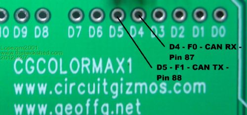 Hi Gizmos, Geoff and JDH2550, I would like to set a standard (or let you guys set a standard or a concensus) for the CGcolormax1 as to which pins numbers to use for a CANport. At the moment I am going with pins 87 and 88. I know they conflict with D4 and D5. Any input or comments please?